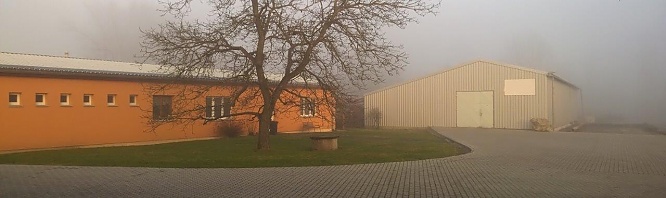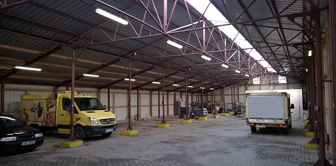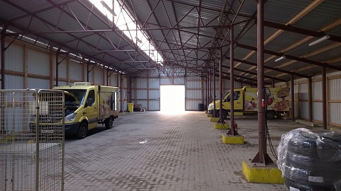 Budova ocelové haly – garáží, plocha 610 m2, osazena vjezdová vrata s úrovňovým napojením na zpevněné plochy před budovou, druhá vrata vedou na improvizovanou rampu z boku budovy s ložnou výškou 50cm s možností využití pro nakládku vozidel.